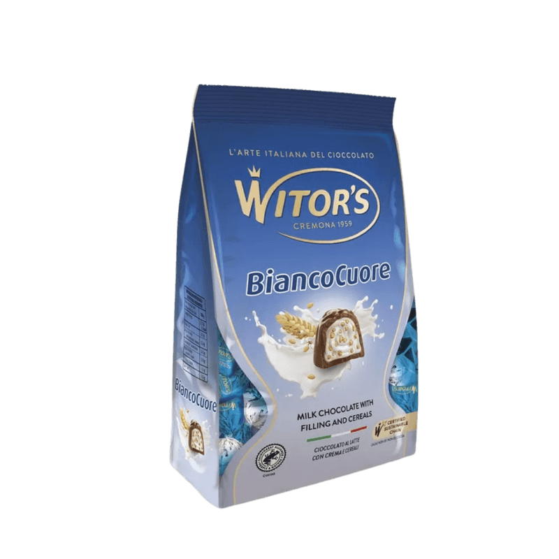 O Bombom Witor's Bianco Cuore é uma deliciosa combinação de chocolate ao leite com recheio cremoso e cereais crocantes, ideal para quem busca sabor e textura em um só produto. Produzido na Itália, com a tradição da marca Witor's desde 1959, cada unidade oferece uma experiência indulgente com o toque especial do leite alpino. A embalagem de 125g é perfeita para compartilhar ou saborear em momentos especiais. Um bombom que une qualidade, sabor e sofisticação.