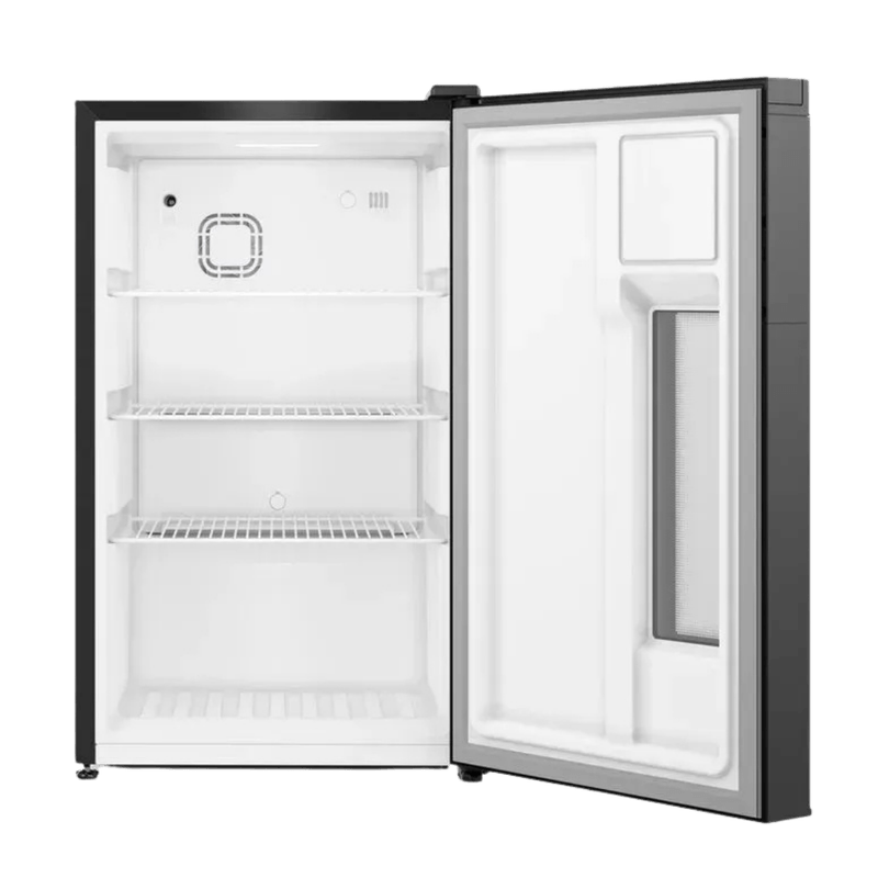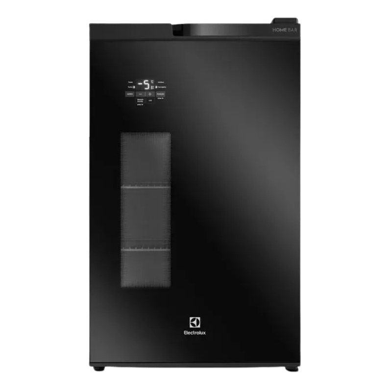 Seu design moderno inclui porta de vidro preta com proteção UV, que permite visualizar o interior sem abrir e mantém a temperatura estável. O sistema Frost Free elimina a necessidade de descongelar,