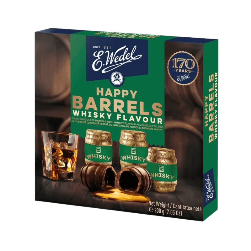 O Chocolate E. Wedel Barril Whiskey é uma experiência sofisticada para os amantes de sabores intensos. Produzido pela tradicional marca polonesa E. Wedel, desde 1851, este produto traz barris de chocolate amargo recheados com licor aromatizado de whisky, oferecendo uma combinação única entre o sabor robusto do chocolate e o toque alcoólico refinado. A embalagem de 200g celebra os 170 anos da marca e inclui bombons envoltos em papel dourado e verde, ideal para presentear ou saborear em momentos especiais.