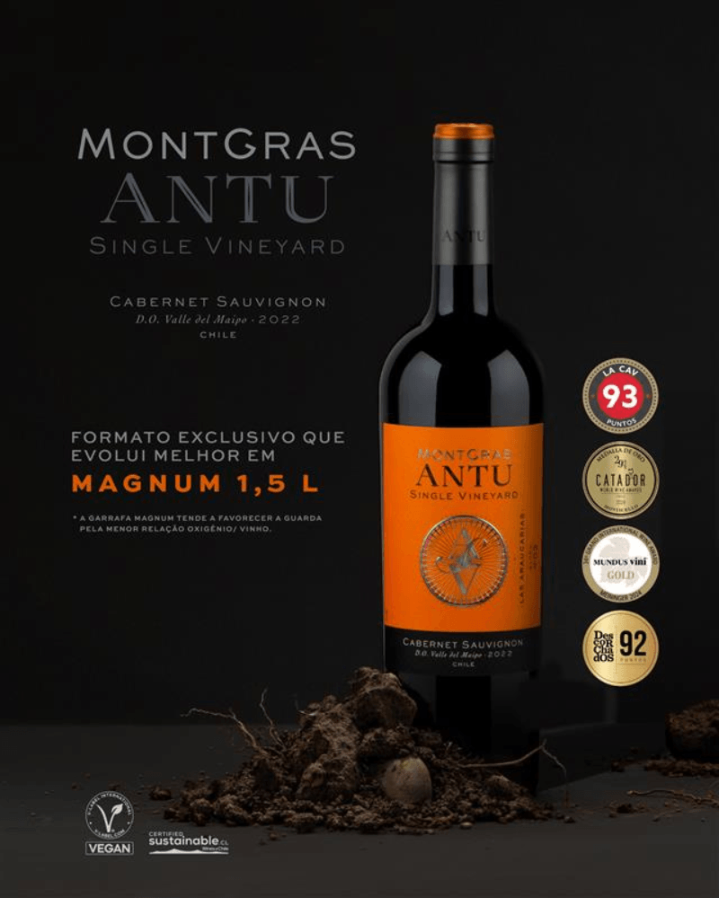 Antu, cujo significado é "Sol" na língua mapudungun, é a linha de vinhos Montgras que se distingue por ser a mis puro reflexo de seu terroir. Este Cabernet Sauvignon vem do Block 03 Las Araucarias, localizado no coração do Alto Maipo. Sua complexidade e elegância são dadas pela influencia da majestosa Cordilheira dos Andes, e pelos seus elevados dias de sol e local de origem. Cor rubi intenso, com aromas de frutas azuis, groselhas, mirtilos e cassis. na boca é sedoso, fresco, com taninos elegante e estruturados. Apresenta notas minerais e especiarias de carvalho e toque maturados.